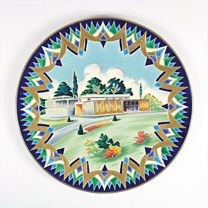 Großer Wand-Teller, "EMAUX DE LONGWY FRANCE", Rehaussé: AK., ausdrucksstarke Farben umrahmen das stilvolle 1950er Jahre Anwesen, goldbemalt, D = 37 cm