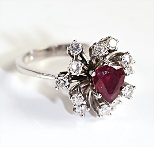 Ring, "KLASSIKER" 1970/80er Jahre, WG 585/000, zentraler Rubintropfen ca. 0,75 ct (dunkle Farbe !), 12 Brillanten ca. 0,40 ct tw/w-si, Ringkopf D = ca. 15,0 mm, RW ca. 50,5