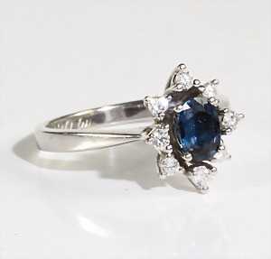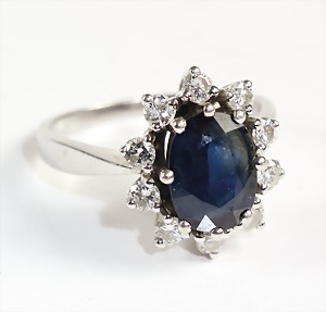 Ring, WG 750/000, 1 Saphir ca. 1,4 ct (facettiert), Brillantkranz mit 8 Brillanten ca. 1,0 ct tw-vsi/si, RW ca. 52,5