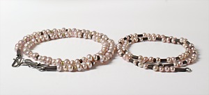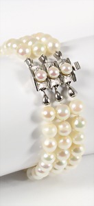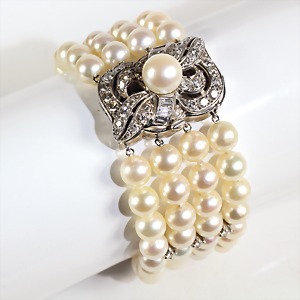Dekoratives Perl-Armband (4-reihig) mit ausgefallener Schließe, WG 585/000 (Säure geprüft), 32 Brillanten ca. 1,55 ct tw/w-vsi/si (wenige Steine p), 6 Diamanten im Baguette-Schliff ca. 0,60 ct tw-vsi, zentrale Akoja-Perle D = 8,7 mm, 4- Reihen Akoja-Perlen mit sehr schönem Lüster, D = 6,7-7,0 mm, 4 Zwischenstege mit 12 Brillanten besetzt. Die Schließe ist schwer gearbeitet, integriertes Kastenschloss und Sicherheitsbügel, L = 18,0 cm
