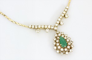 Klassisches Collier, GG 585/000, Hänger mit Smaragd-Tropfen ca. 1,50 ct facettiert (beweglich gearbeitet), 50 Brillanten total ca. 3,0 ct feines weiß - vsi/si, kleines Kastenschloss mit Sicherheitsacht, L = 42,5 cm, total 19,00 g,