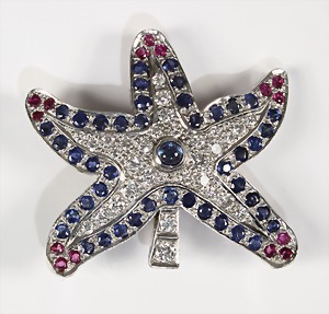Brosche, WG 750/000, 31 Brillanten 1,0 ct tw/si, 59 Saphire/Rubine (facettiert), 1 Saphircab., ca. 30,0 x 34,5 mm, total ca. 14,2 g (mit Zertifikat, DM 6000,- !)