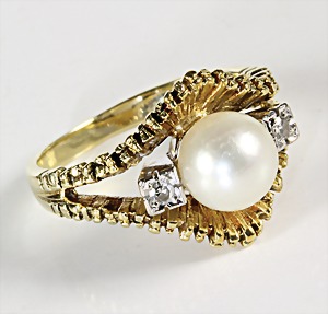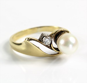 Ring, GG 585/000, 1 Akoja-Perlen D = 7,0 mm, 1 Brillant ca. 0,08 ct weiß (weiß gefasst), RW ca. 61