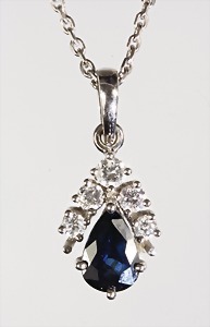 Collier mit Anhänger, WG 585/000, zentraler Saphir ca. 0,75 ct Tropfen (facettiert), 5 Brillanten ca. 0,20 ct tw-vsi; Ankerkette geschliffen, WG 585/000, L = 42,0 cm
