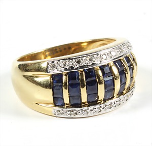 Ring, GG 750/000, sig.: LM (Louis Margeaux), 18 Brillanten ca. 0,10 ct w-si (weiß gefasst), 21 Saphire im Carreé-Schliff ca. 1,3 ct, RW ca. 55,5