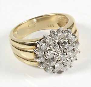 Ring, "KLASSIKER", GG 585/000, 25 Brillanten ca. 1,25 ctw-si (weiß gefasst), Ringkopf D = 14,3 mm, RW ca. 56,0 (mit Schmuckpass)