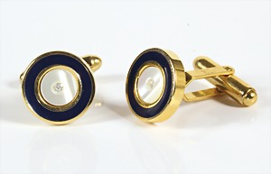 Manschettenknöpfe, "DIOR", goldfarbenes Metall, sig.: Christian Dior, Perlmutter mit weißem Stein, blau/schwarzer Emaillelack, D = 14,3 mm