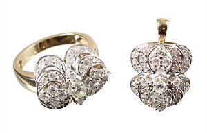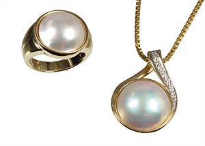 Lot Schmuck mit Mabe-Perlen, GG 585/000, 1 Ring, D = 14,8 mm, RW ca. 49,5; Anhänger, 6 Diamanten weiß, H = 26,5 mm; Venezia-Kette L = 42,0 cm