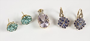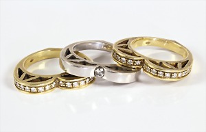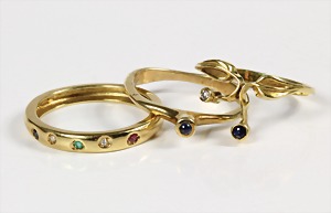Lot 3 Ringe: GG 585/000, 1 Ring mit je 1 Rubin, Saphir, Smaragd u. 2 Diamanten weiß, RW ca. 57; 1 Ring mit Saphir, RW ca. 52,5; 1 Ring "BLÄTTER" mit Saphir u. Brillant weiß, RW ca. 53