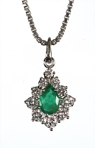 Anhänger, schöner "KLASSIKER", WG 750/00, zentraler Smaragd Im Tropfen-Schliff ca. 0,50 ct, 10 Brillanten ca. 0,50 ct tw-if (lupenrein) H = 2,0 mm, Veneziakette, WG 750, L = ca. 38,5 cm