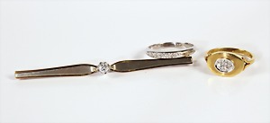 Lot Goldschmuck: 1 Ring (ovaier Ringkopf), GG 750/000, 7 Diamanten weiß, RW ca. 54,5; 1 Ring, WG 585/000, 7 Diamanten ca. 0,08 ct weiß, RW ca. 56; 1 Nadel, GG 585/000, 1 Brillant ca. 0,16 ct tw-vsi (eher besser), L = 69,8 mm