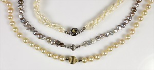 Lot Perlenketten: 1 Süßwasserkette (3 reihig), Schließe Silber (kl. Perle fehlt), L = 44,0 cm; 1 Süßwasserkette, Schließe WG 585/000, L = 43,5 cm; 1 Akoja-Perlenkette, Schließe GG 585/000, Perlen D = 7,0-7,5 mm, L = 50,0 cm