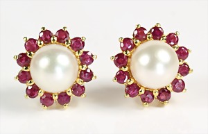 Paar Ohrstecker, GG 750/000, 2 Akoja-Perlen D = 8,1 mm, 24 Rubine ca. 1,2 ct facettiert, D = 14,4 mm (ohne Mechaniken !)