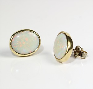 1 Paar Ohrstecker, GG 585/000, 2 Opalcabochon ca. 3,0 ct (Australien) schönes, Farbenspiel in vorwiegend rot u. grünen Farbtönen, ca. 9,3 x 11,0 mm