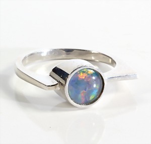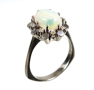 Ring, WG 585/000, Opalcabochon ca. 2,5 ct (Australien) schönes, lebhaftes Farbenspiel in vielen Farbtönen, 8 Brillanten ca. 0,16 ct tw-vsi, RW ca. 61