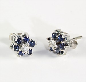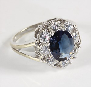Ring, "KLASSIKER" 1970/80er Jahre, WG 585/000, zentraler Saphir ca. 2,0 ct (facettiert), 10 Brillanten kranzförmig angeordnet, ca. 0,40 ct tw/w-vsi, RW ca. 51,5