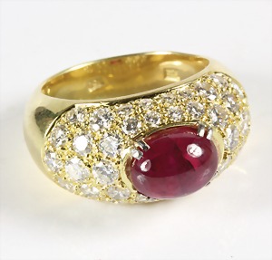 Ring, GG 750/000, zentraler Rubincabochon ca. 2,5 ct, kompletter Ringkopf mit Brillanten ausgefasst, Brillanten ca. 1,65 ct tw-vsi, seitlich 8 St. 8-kant Diamanten weiß, RW ca. 52, total 9,5 g