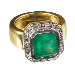 Ring, GG/WG 750/000, zentraler Smaragd mit Brillantkranz, Smaragd ca. 4,5 ct, ca. 10,0 x 9,2 mm, intensive Farbe ! (als 8-Eck geschliffen), 19 Brillanten ca. 0,50 ct tw/w-si, RW ca. 58, total 18,5 g