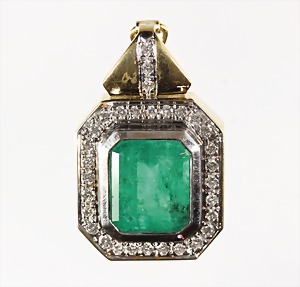 Anhänger, GG 750/000, zentraler Smaragd mit Brillantkranz, Smaragd ca. 47,0 ct, ca. 12,5 x 10,5 mm, intensieve Farbe ! (als 8-Eck geschliffen), 31 Brillanten ca. 0,62 ct tw/w-si (weiß gefasst), H = 31,4 mm, Schlaufe zum Aufklappen, total 14,4 g