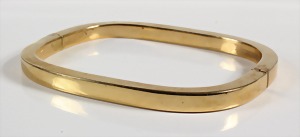 Armband "VINTAGE" 1970er Jahre, GG 750/000, rechteckig gearbeiteter Reif mit weichen Ecken, integriertestes Kastenschloss mit Schnepper, Scharnierbewegung. B = 5,0 mm, innen: 61,0 x 49,8 mm, total ca. 23,1 g