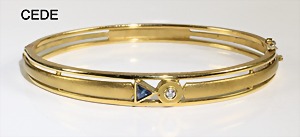 Armreif "CEDE" Pforzheim, GG 750/000, 1 Brillant ca. 0,045ct tw-vsi/si, 1 Saphir-Triangel, integriertes Kastenschloss mit Sicherheitsacht, innen: ca. 60,0 x 50,3 mm, total 25,3 g, aus Geschäftsauflösung, Neupreis € 3200,- !!