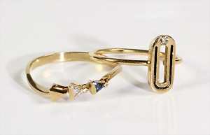 Lot 2 Ringe: 1 Ring, GG 585/000, 1 Diamant Triangel, 1 Saphir Triangel, RW ca. 53,5; 1 Ring, GG 750/000, 1 Diamant weiß, schwarzer Emaillack, RW ca. 52