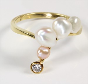 Ring, GG 585/000, 4 Süßwasser-Perlen, 1 Brillant ca. 0,05 ct weiß, RW ca. 54,5