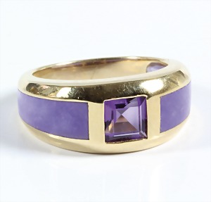 Ring, GG 585/000, zentraler Amethyst im Carré-Schliff, seitlich mit lilafarbenem Kunststoff ausgelegt, RW ca. 54,5