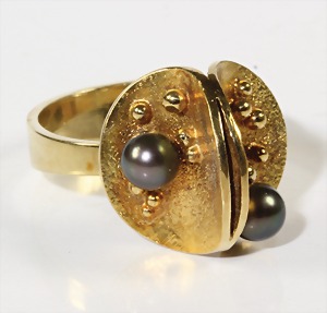 Ring "VINTAGE" 1960/70er Jahre, GG 585/000, 2 Akoja-Perlen D = ca. 4,5 mm, RW ca. 56,5