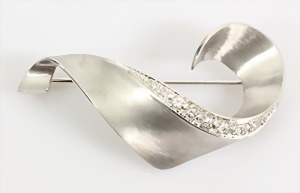 Brosche, WG 585/000, 5 Brillanten ca. 0,15 ct tw-vsi/si, 2 Diamanten weiß, L = 51 mm, total 8,8 g