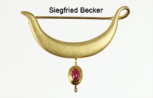 Brosche "SIEGFRIED BECKER", GG 585/000 sig.: SB, kl. Rubincabochon, L = 36,7 mm