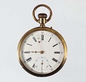 Sprungdeckel Herrentaschenuhr (Savonette)", Schweiz um 1900/05, "REPETITION u. CHRONOGRAPH, GG, 750/000, gut erhaltenes cremefarbenes Emaille-Zifferblatt, röm. Zahlen, feine gebläute Zeiger, Stoppuhr, Schlag auf Feder (1/4 u. Std. Schlag), Std./Minutenzeiger, kl. Sek. Auf 6 Uhr, Staubdeckel GG 750/000, N° 17747, D = 56,3 mm, Sprungdeckel graviert, Gehäuse mit Gebrauchsspuren, Uhr läuft ! Passend zur Taschenuhr, eine Uhrenkette GG 750/000, leicht gedrehte Panzerkette mit Knebelschverschluss, L = 27,0 cm, alles total 152,0 g,