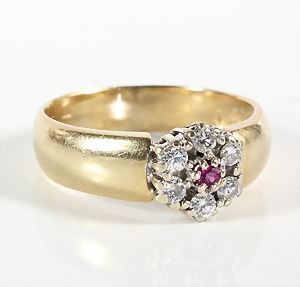Ring, GG 585/00, zentraler Rubin, 6 Brillanten ca. 0,19 ct w-si, RW ca. 53,5