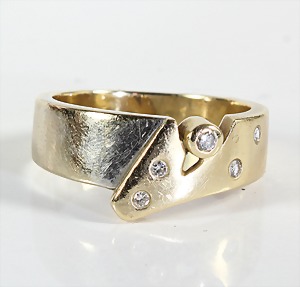 Band-Ring, GG 585/000, 1 zentraler Brillant ca. 0,50 ct getönt, seitlich 2 Brillanten, total ca. 0,35 ct tw/W-vvsi, RW ca. 57,5. Schöner Klassiker !