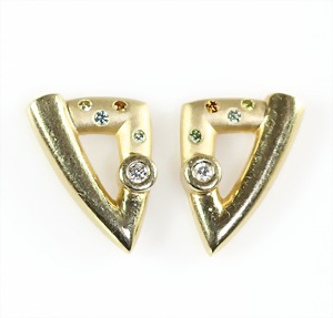 1 Paar Ohrstecker, 2 Brillanten ca. 0,04 ct tw-vvsi, 8 farbige u. weiße Brillanten ca. 0,08 ct, ca. 11,2 x 17,5 mm