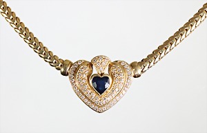 Collier "HERZ", GG 585/000, zentraler Saphir in Herzform ca. 1,80 ct (7 x 7 mm), 70 Brillanten ca. 0,60 ct. w-si, L = ca. 44,5 cm, Karabiner in Double !