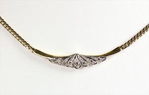 Collier mit Mittelteil, GG 585/000, 7 Diamanten weiß (weiß gefasst), Kastenschloss mit Sicherheitsacht, L = ca. 41,0 cm