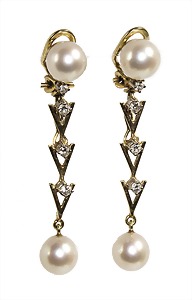 1 Paar Perl-Ohrhänger (Clips), GG 585/000, 4 Akoja-Perlen D = ca. 8,0 mm, schönes Lüster, 8 Brillanten ca. 0,30 ct tw/w-vsi/si, H = ca. 4,9 cm, Gehänge abnehmbar !