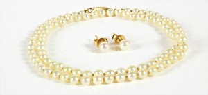 Lot: Kette u. Ohrstecker, GG 585/000, Kette, feine Akoja-Perlen D = 3,5 - 3,9 mm, L = 42,5 cm; Ohrstecker, 2 Akoja-Perlen D = 4,8 mm