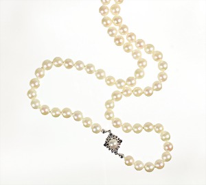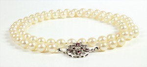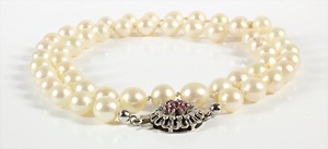 Akoja-Perlenkette, WG 585/000, Schließe mit 7 Rubinen, Akoja-Perlen D = 8-8,5 mm, L = 58,5 cm, gutes Lüster !
