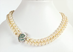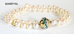 Akoja-Perlenkette von "SCHÖFFEL", WG 585/000, sig.: S, Schließe mit 30 Smaragden im Carré-Schliff u. 18 Brillanten ca. 0,15 ct weiß, "PATENT-SCHLIESSE", Akoja-Perlen D = 7,5-7,9 mm, L = 49,5 cm, schönes Lüster ! (mit Zertifikat !)