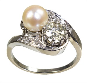 Ring, WG 585/000, 1 Brillant ca 1,0 ct w/leicht getönt-vsi, 1 Akoja-Perle D = 7,5 mm, seitlich 8 weitere 8/8-kant Diamanten weiß, RW ca. 60,5