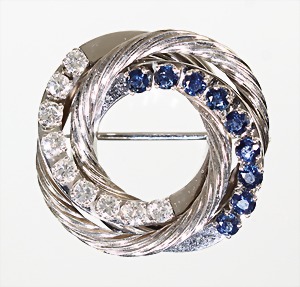 Brosche, WG 750/000, 9 Brillanten ca. 0,40 ct tw-vsi, 9 Saphire ca. 0,9 ct (facettiert), D = ca. 25,0 mm, (Broschhaken fehlt), total 13,8 g