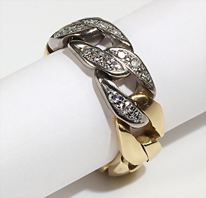 Ketten-Ring, GG/WG 750/000 (säuregeprüft), 18 St. 8/8-Diamanten ca. 0,25 ct weiß, B = ca. 7,9 mm, RW ca. 56,5, klassische Panzerkettenglieder, angenehm zu Tragen, total 12,1 g