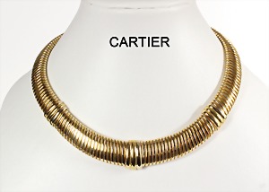 Reifartiges Collier von"CARTIER", GG 750/000, sig. Cartier, Ref Nr° 702045, durch spezielle Verbindungstechnik in alle Richtungen flexibel, 3 Applikationen verleihen dem Collier einen zurückhaltenden Schick ! Integriertes Kastenschloss mit Sicherheitsacht, B = 8,0 - 18,5 mm, L = 39,0 cm, total 67,9 g