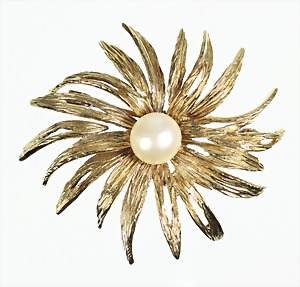 Nadel/Brosche 1950/60er Jahre, GG 585/000, granuliertes Mittelteil (ca. 586 Kugeln !) mit Akoja-Perle D =5,5 mm, L = 64,3 mm