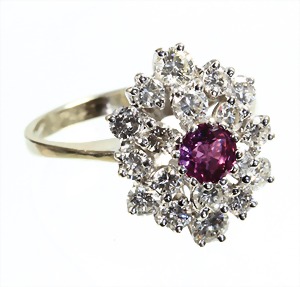 Ring, WG 585/000, zentraler Rubin ca. 0,5 ct, 2 Brillantkränze ca. 1,20 ct, tw/w-vsi, RW ca. 56
