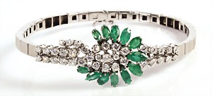 Armband aus den 1970/80er Jahren, WG 750/000, im Bogen gesetzte Smaragde ca. 1,90 ct (im Navette-Schliff), 37 Brillanten ca. 1,35 ct tw/w-vsi, integriertes Kastenschloss mit Sicherheitsacht, Band beweglich gearbeitet, L = 19,5 cm