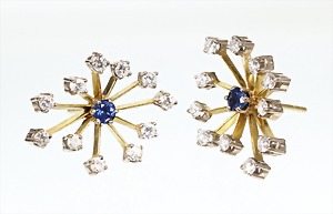 1 Paar Ohrstecker, GG 750/000, zwei zentrale Saphire total ca. 0,60 ct, 20 Brillanten ca. 0,85 ct tw-vsi (weiß gefasst), ca. 17,0 x 23,0 mm, ohne Ohrsteckermechanik !