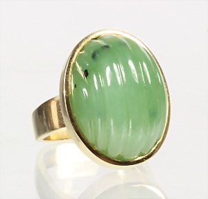 Ring 1960/70 Jahre, GG 750/000, gravierte "RUSSISCHE-JADE" ca. 15,0 x 20,0 mm, RW ca. 53 (Ringschiene eckig !)